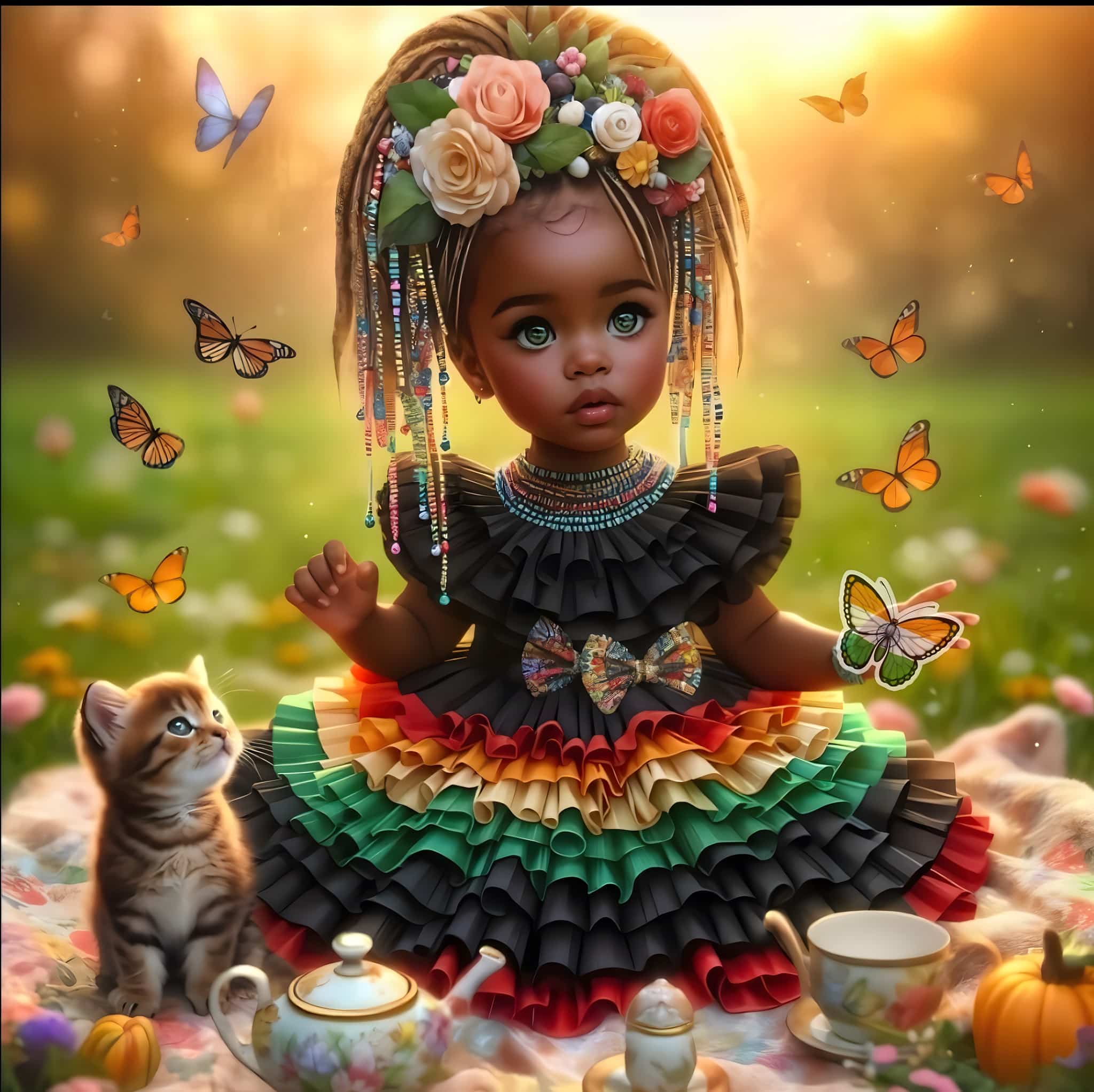 But what truly brings this scene to life are the butterflies – a kaleidoscope of winged wonders fluttering around her. Each butterfly is a tiny masterpiece of color and detail, symbolizing transformation, hope, and the fleeting beauty of life’s precious moments.