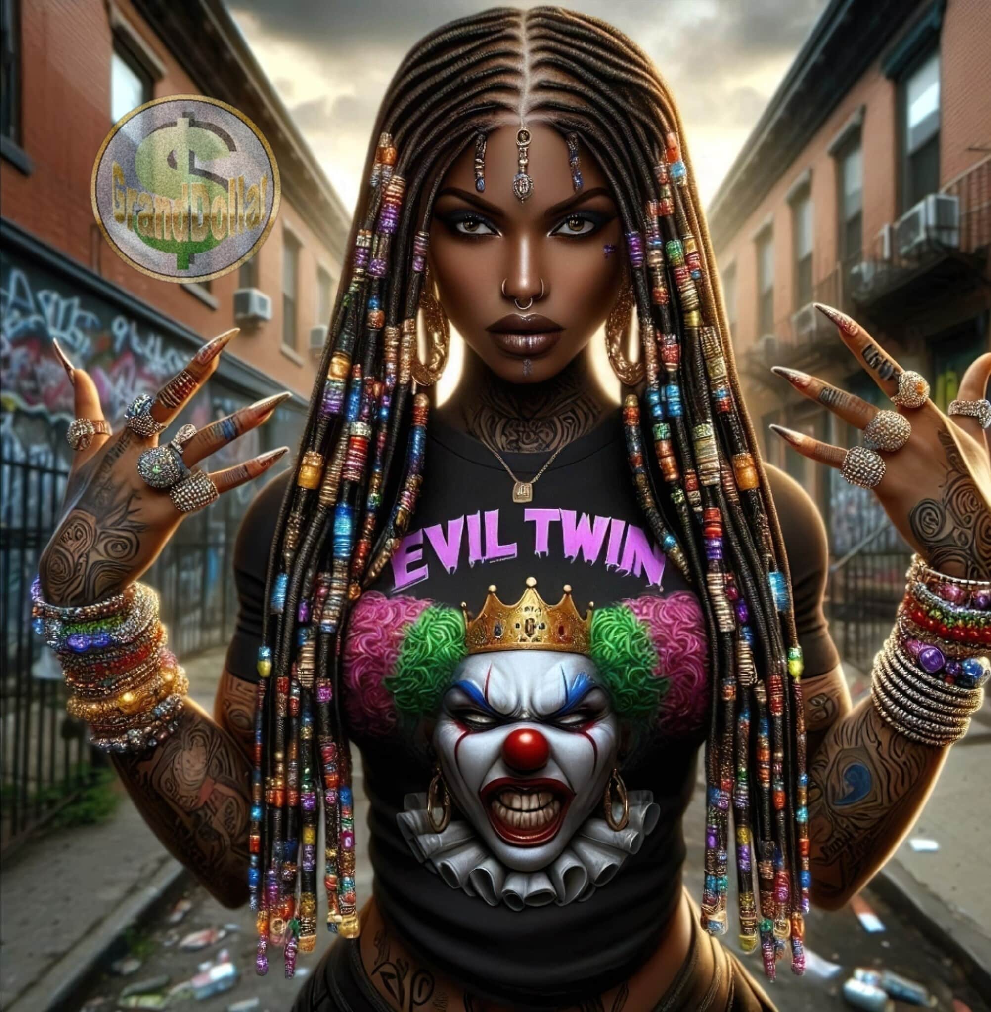 The Message: Front and center, an angry clown face snarls beneath the words “Evil Twin,” daring onlookers to look twice and think again about their assumptions.
